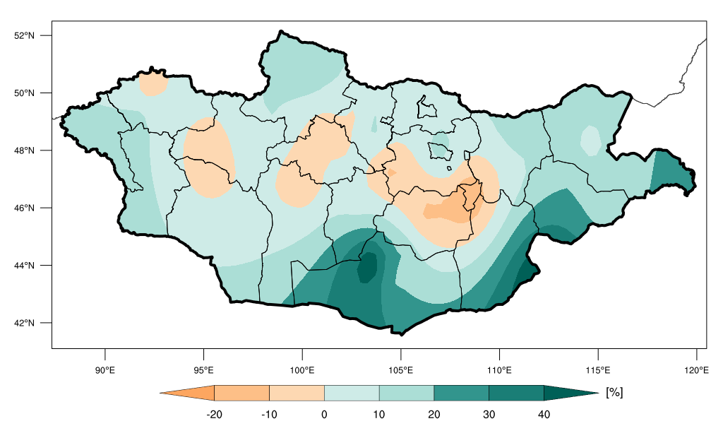Жилийн нийлбэр хур тунадасны олон жилийн хэлбэлзэлд тодорхой өссөн буурсан хадлага илрээгүй ч газарзүйн тархалтаар авч үзвэл Архангайн Эрдэнэмандал, Төвийн Эрдэнэсант, Дундговийн Мандалговь, Говьсүмбэр Чойр, Сүхбаатар Эрдэнэцагаан нутгаар 10-40%-иар буурсан хандлага харагдаж байна (Зураг1).