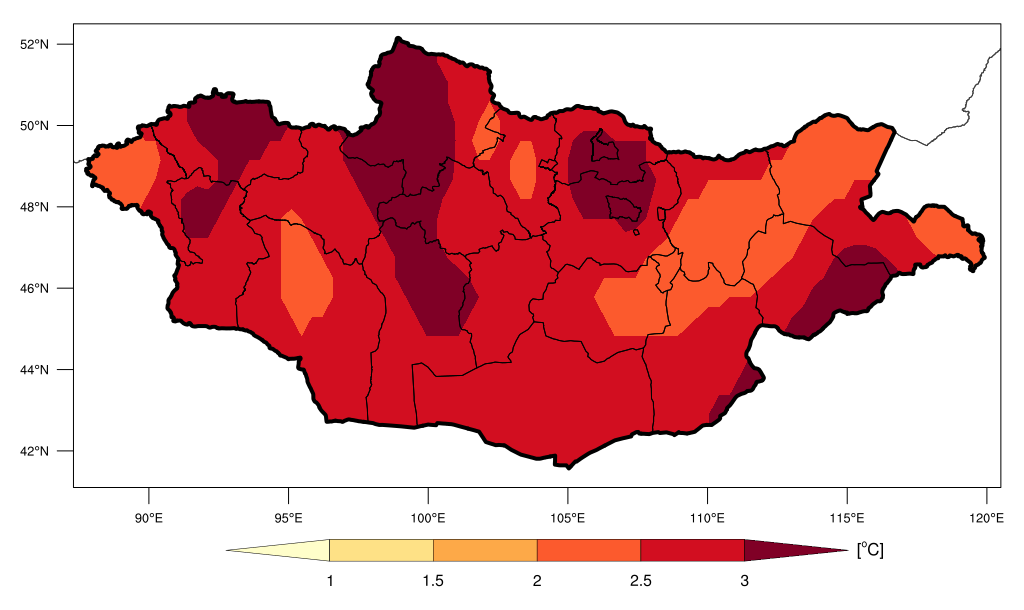 Монгол орны жилийн дундаж агаарын дундаж температур 1940-2025 оны хооронд 2.58°С/86жил –аар дулаарч байгаа бөгөөд энэхүү дулааралт нь газар нутгийн онцлогоос хамаарч харилцан адилгүй илэрч байна. Хамгийн их дулааралт Улаанбаатар хот, Увсын Улаангом, Хөвсгөлийн Мөрөн, Сэлэнгийн Баруунхараа, Сүхбаатарын Баяндэлгэр сум орчмоор ажиглагдаж байгаа бөгөөд 3.3-аас 3.8°С-аар дулаарчээ (Зураг 1).