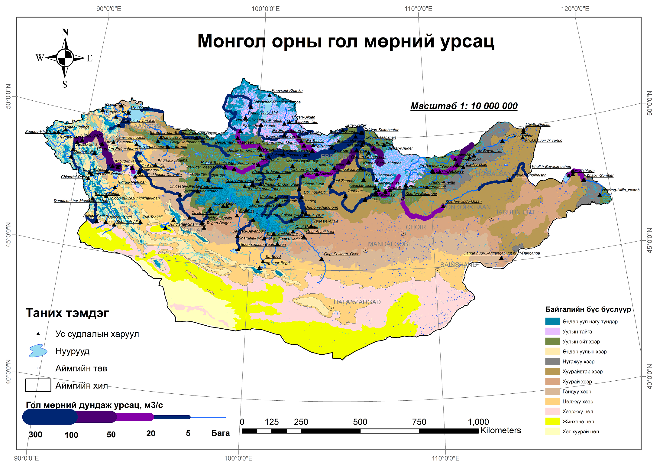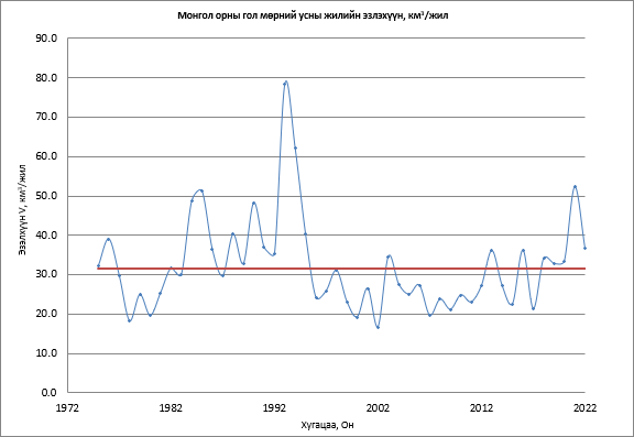 Манай орны гол мөрний урсацын жилийн дундаж нөөцийн олон жилийн явцыг доорх графикаас харж болно (1975 оноос одоог хүртэл). Монгол орны усны нөөцийг голлон бүрдүүлэгч томоохон ай савыг төлөөлөхүйц 8 голуудаар бэлтгэсэн энэхүү тооцоолол нь ус ашиглагчдын хувьд чухал анхан шатны мэдээ болно. Тухайлбал усны нөөцийн 15 хүртэл хувийг ус хангамж болон бусад зориулалтаар ашиглаж болохоор тооцсон байдаг. Мөн сав газрын усны нөөцийн нэгдсэн менежментийн төлөвлөгөөг хэрэгжүүлэх, хянахад суурь мэдээлэл болж бодлого боловсруулагч, шийдвэр гаргагчдад болон бусад бичиг баримтын ШУ-ны үндэслэл болно.
